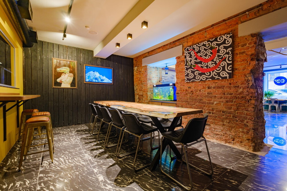 Пространство оформили с помощью картин и тканевых полотен, дизайнеры сохранили некоторые элементы прежнего «Крокодила» — к примеру, конструкцию из веток на веревочных подвесах над барной стойкой. В ресторане два зала, в одном из них установили коммунальный стол из цельной древесины.
