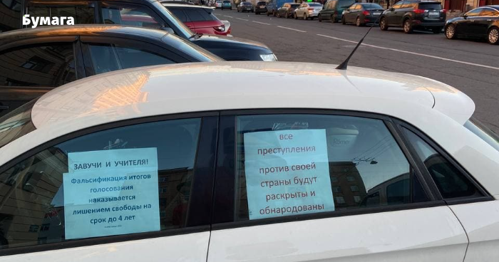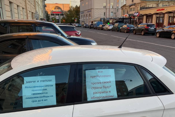 На окнах автомобиля, припаркованного у УИК № 1622 у Сытного рынка на Петроградской стороне, разместили листовки с призывом не фальсифицировать результаты голосования. Они обращены к учителям и директорам школ. Эти плакаты находятся там минимум с субботы.