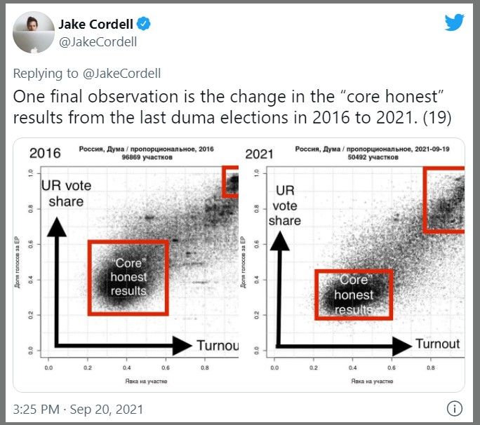 “The picture of fraud is almost the same as it was in 2016,” Shpilkin told Meduza, though he points out that “real modal turnout” was 3–5 percent higher in these elections than it was five years ago. In other words, even when downplaying the precincts with abnormally high voter participation, the most frequently recorded turnout in the 2021 parliamentary elections was higher than in 2016. Researchers also found the same suspicious asymmetry present five years ago in the peaks of turnout and votes for United Russia, though the “right tail” in the graph for this weekend’s results shifted even more to the right, meaning that Russia’s party of power performed even better this year where turnout was highest.