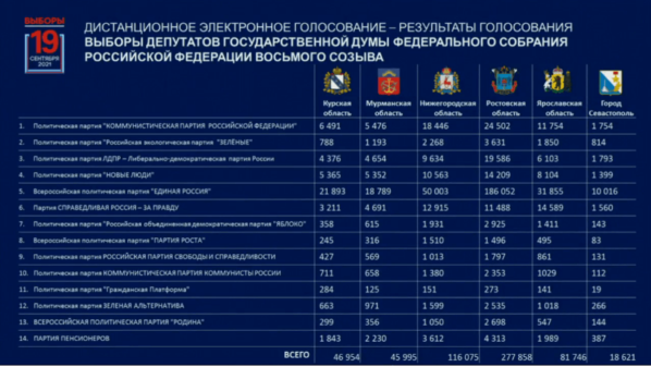 Результаты ДЭГ во всех регионах, кроме Москвы, ЦИК опубликовал поздно вечером 19 сентября. Во всех областях лидирует «Единая Россия». Больше всего голосов (186 тысяч из 277 тысяч, то есть около 66%) партия получила в Ростовской области. В этом регионе среди прочего могли голосовать до 600 тысяч жителей ЛНР и ДНР с российскими паспортами. Многие получили документы прямо перед выборами, часть — даже в день волеизъявления, а в российский регион их свозили автобусами и поездами.