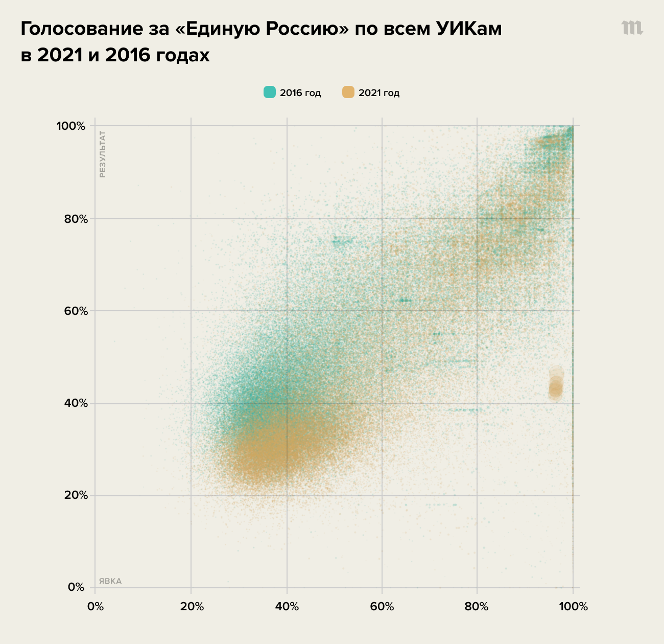 Эти изменения можно проследить на двух графиках, один из которых вы видите ниже. Оба графика сделаны на основе данных ЦИК, которые собрал независимый электоральный аналитик Сергей Шпилькин. Точки — это все УИКи России. На горизонтальной оси — явка на том или ином участке. На вертикальной — процент, полученный партией. Небольшое пятно справа — результаты московского электронного голосования. Что может означать похожий на «комету» график? Почему результаты «Единой России» ухудшились? И как дела у КПРФ? Отвечаем на эти вопросы по ссылке.
