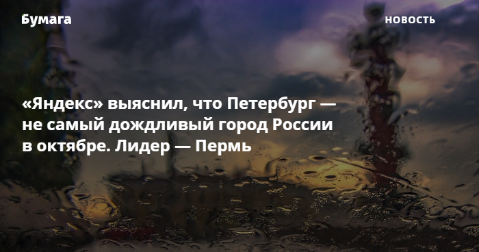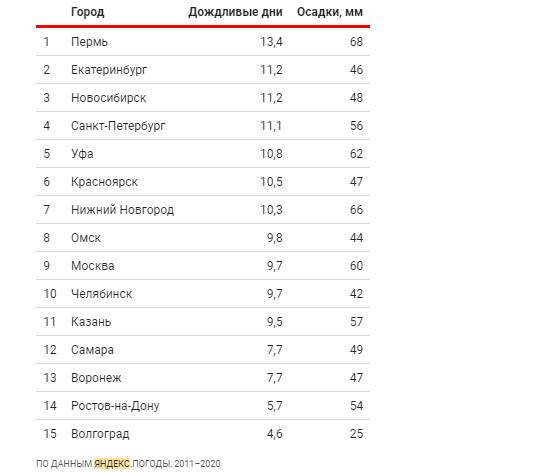 Из анализа следует, что Петербург — не самый дождливый город в это время года. По усредненным данным «Яндекса» за десять лет наблюдений, в октябре в Петербурге дождь идет в среднем 11 дней, а в Перми — 13 дней.
