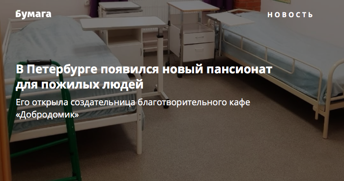 Новый пансионат для пожилых людей открылся в Красногвардейском районе Петербурга. Об этом «Бумаге» рассказала Александра Синяк — автор проекта, а также создательница благотворительного кафе «Добродомик».