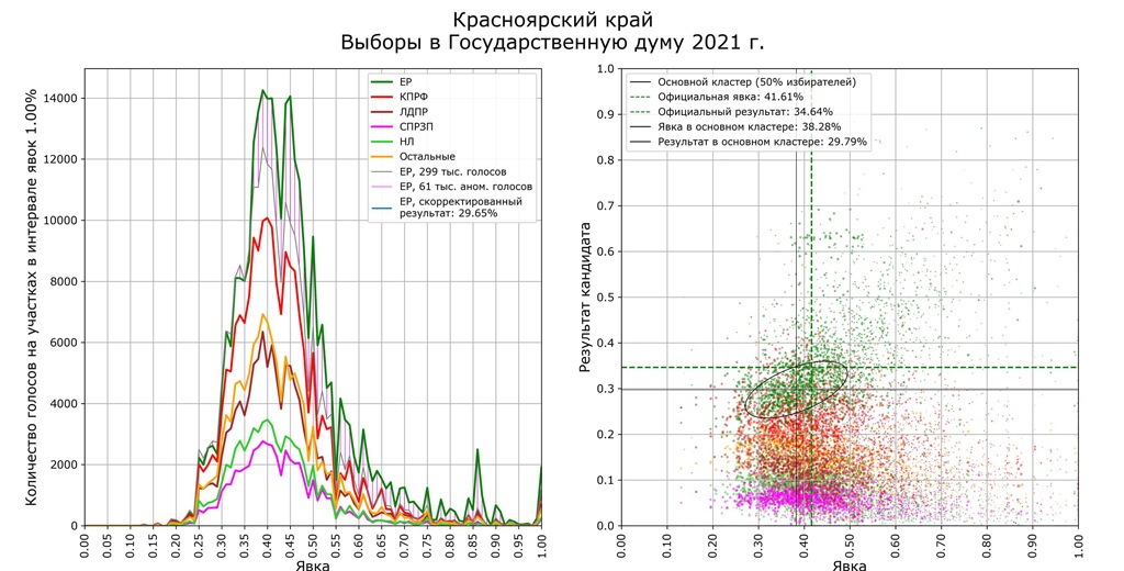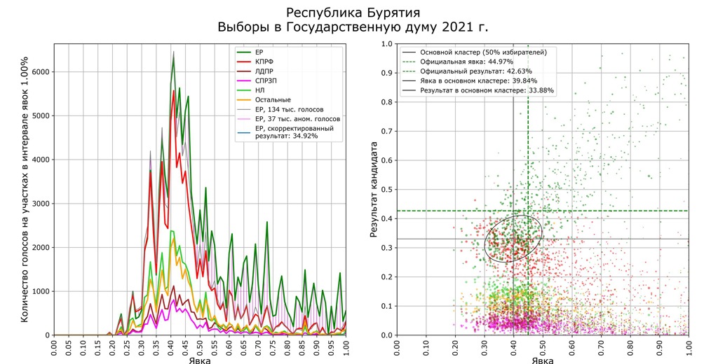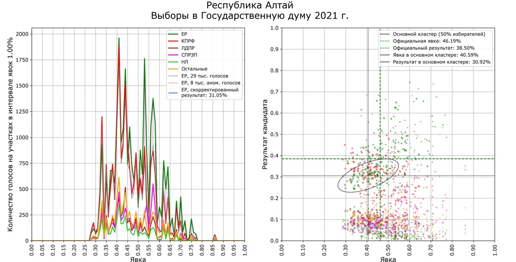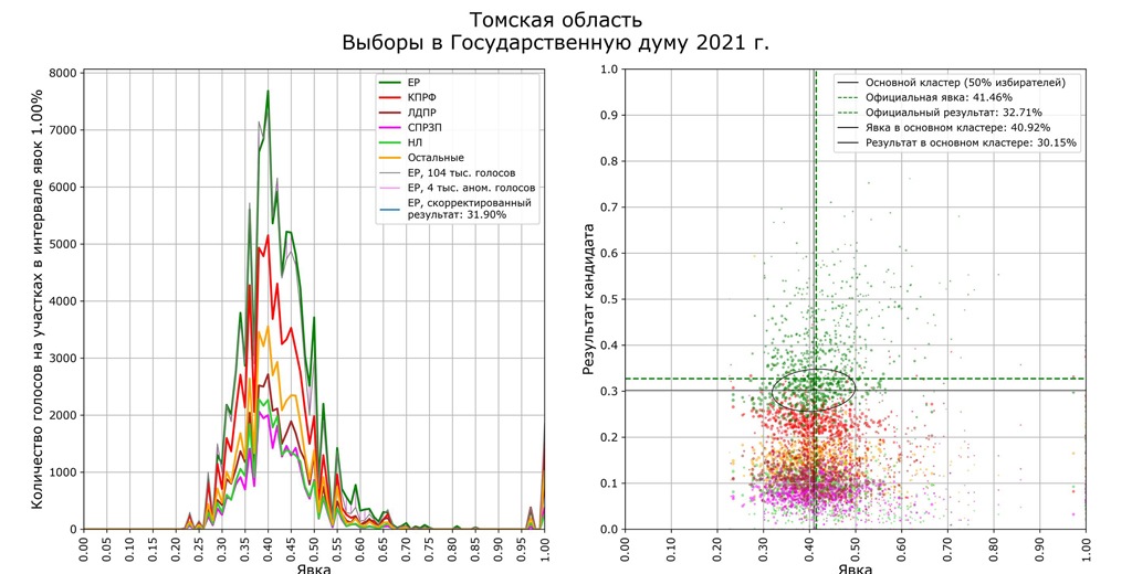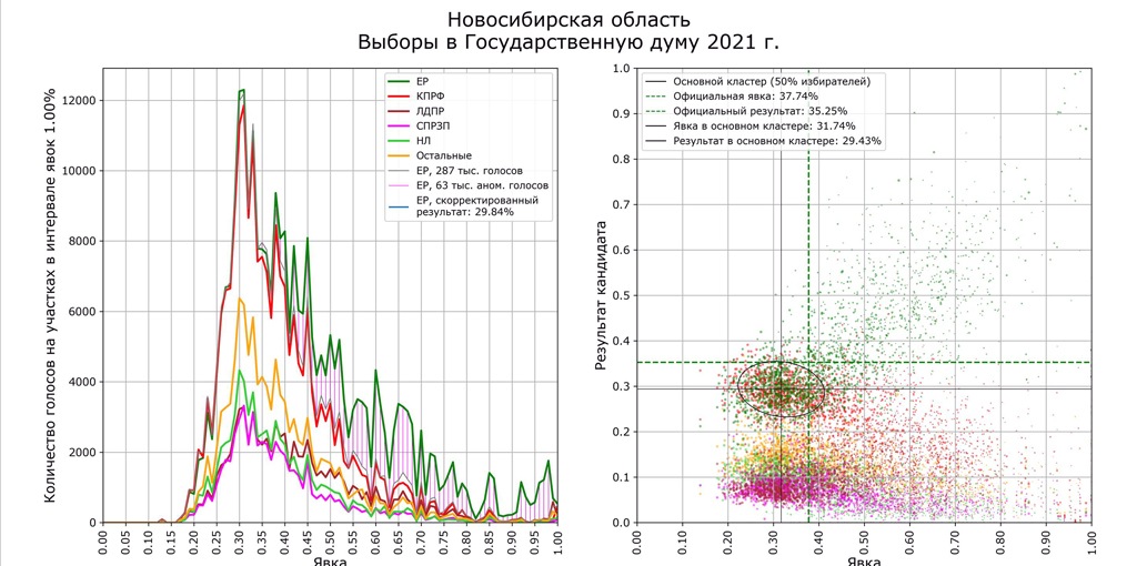 Математик и независимый аналитик Сергей Шпилькин, который уже много лет занимается мониторингом итогового соотношения явки и результатов, проанализировал голоса по 96 840 участкам (107,9 млн избирателей из 109,2 млн). Он сопоставил средние данные с участков и результаты партий в зависимости от явки (чем выше явка и выше результат одной из партий, тем больше вероятности, что итоги фальсифицированы).
