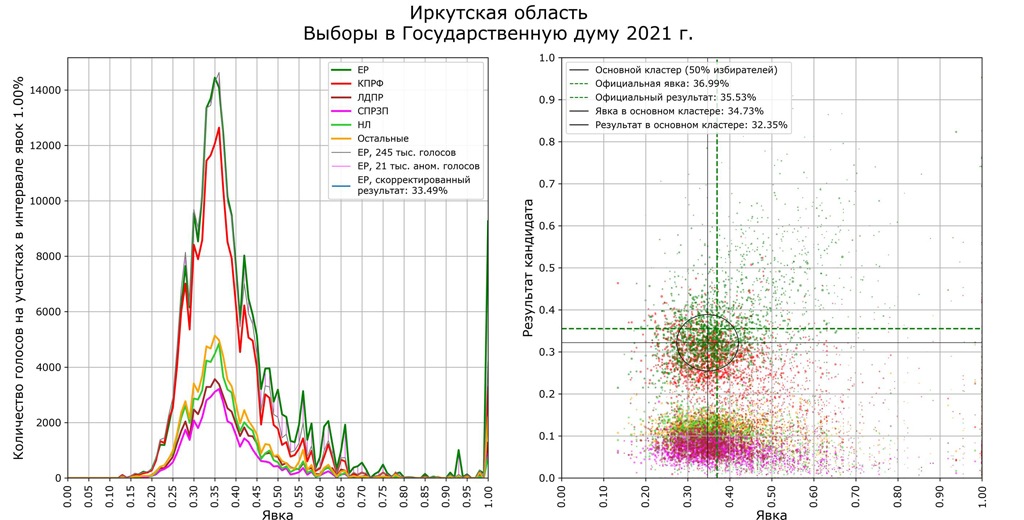 В Иркутской области отмечены небольшие аномальные зоны. Здесь, по подсчетам Шпилькина, «ЕР» могла бы получить около 33% вместо 35%. Судя по данным ГАС. Выборы, в Аларском районе «ЕР» на некоторых участках получала 50−80% голосов при высокой явке. Там находятся воинские части.