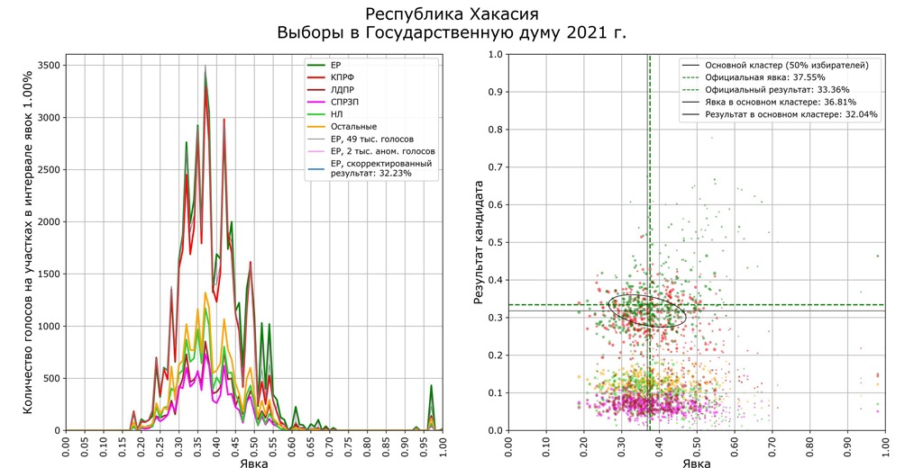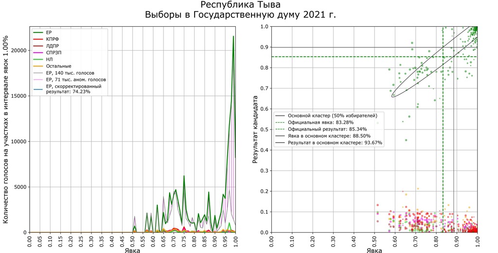 Именно Хакасия показала наиболее «чистую» картину голосования. Здесь «ЕР» получила 33,36%, КПРФ — 29,85%. Единственный аномальный участок в Абакане — №432. Там из 949 избирателей пришли 930, и за «ЕР» оказалась почти половина. УИК находится на территории СИЗО-1. Кроме того, нетипичный для региона разрыв наблюдался в Таштыпском районе — 41,55% у «ЕР» против 28,38% у КПРФ (на нескольких УИКах за «ЕР» было 60−70%).