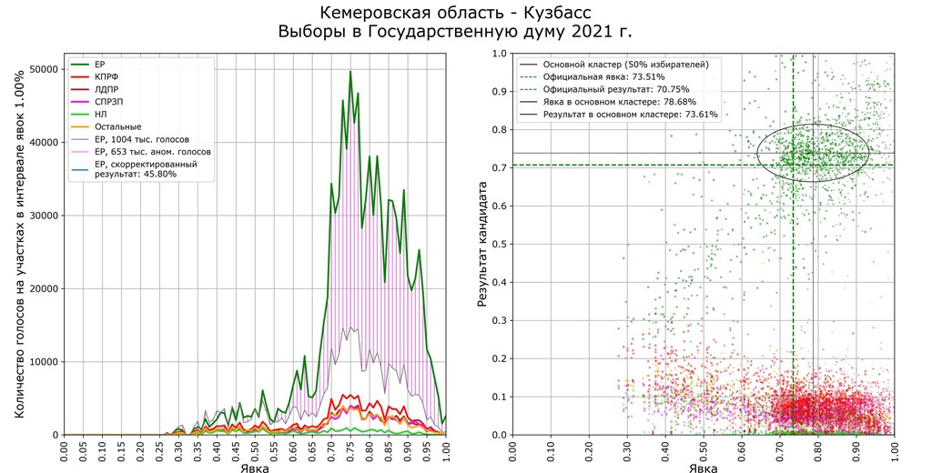 Судя по диаграмме, «Единая Россия» вместо 1 млн голосов должна была получить в Кузбассе около 350 тыс. Партия все равно бы выиграла в регионе, набрав около 45,8% и показав один из лучших результатов в Сибири, но этого, вероятно, недостаточно.