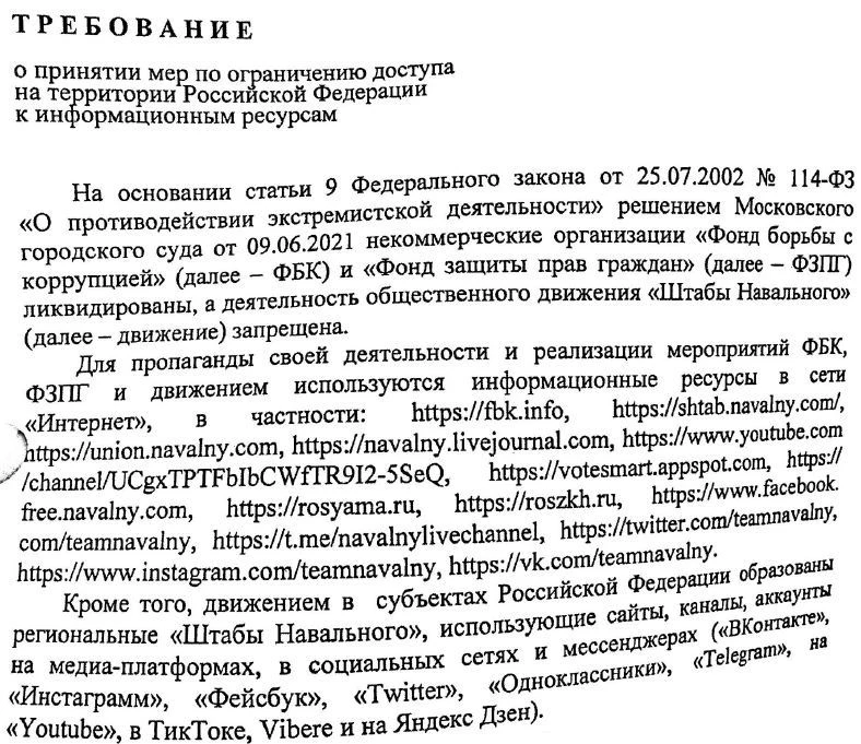 «В приложении к требованию на 19 листах перечислены страницы в Instagram, Facebook, Youtube, Twitter, TikTok, «ВКонтакте», «Одноклассниках», «Яндекс.Дзен», каналы и боты в Telegram, а также сайты отдельных проектов», — сообщается в телеграм-канале «Сетевых Свобод».