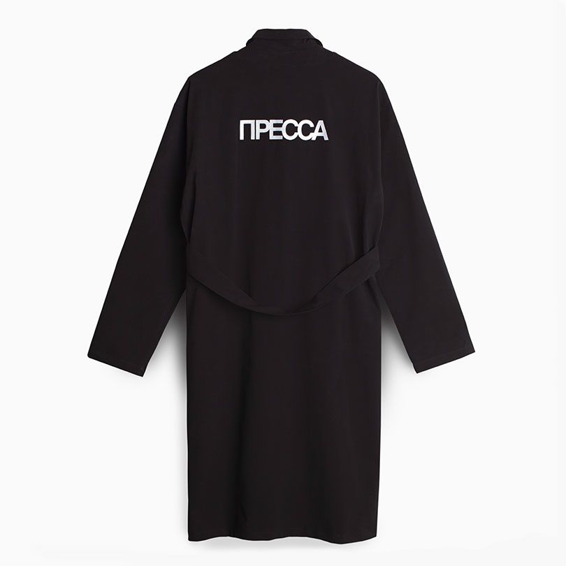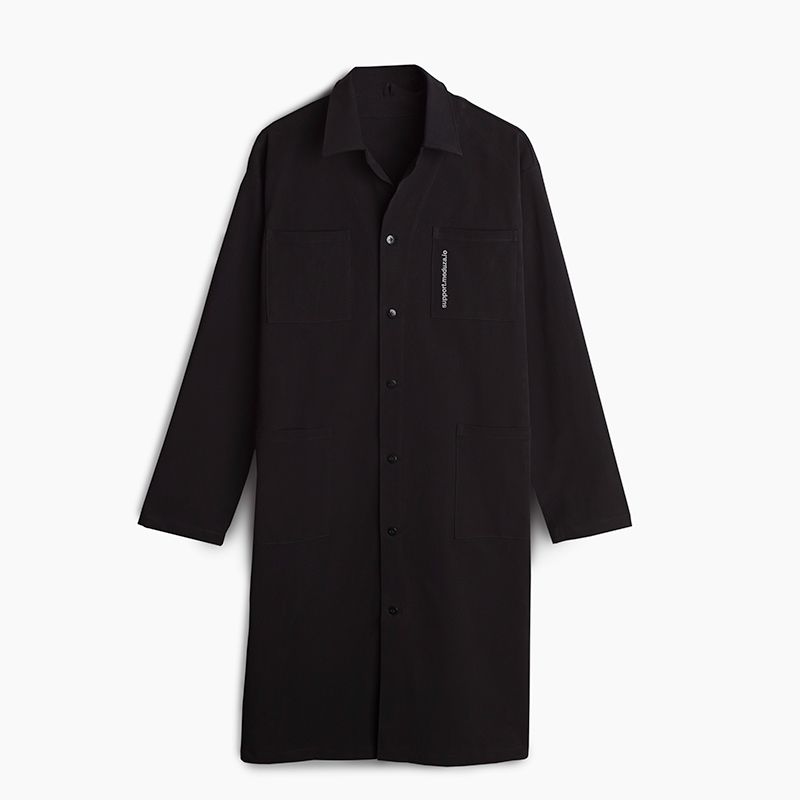 Черный пыльник, созданный на основе фирменных халатов Friend Function (отсылающих к советской рабочей одежде — примерно в таких халатах ходили в советских НИИ и на заводах).