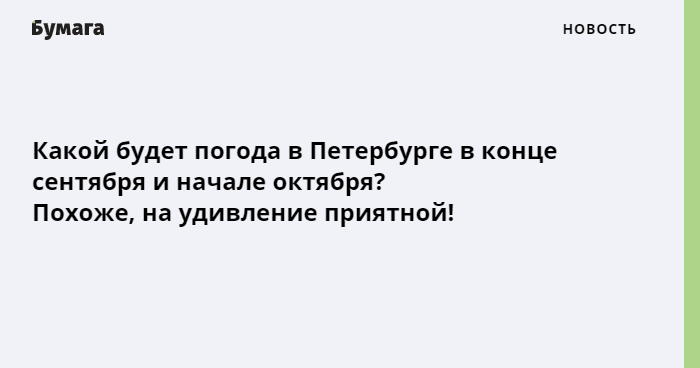 В конце сентября и начале октября в Петербурге ожидается сравнительно теплая погода. Об этом «Бумаге» рассказал главный синоптик города Александр Колесов.