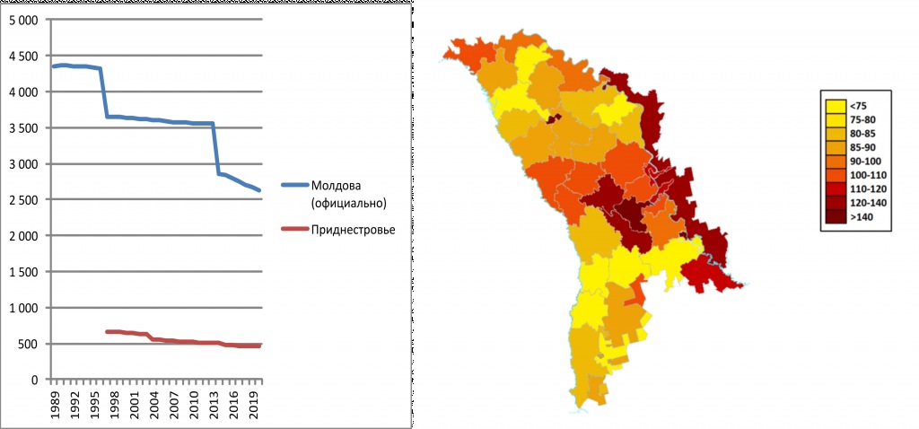 В три постсоветских десятилетия население левобережья Днестра (плюс город Бендеры), то есть Приднестровья, упало примерно на 30%, а население междуречья Днестра и Прута (то есть территория, контролируемая Республикой Молдова) — почти на 40%. В целом на момент распада Советского Союза в Молдавской ССР проживало 4,363 млн человек. На 2020 год на этой же территории по официальным данным проживало не больше 3,1 млн. В действительности, возможно, и меньше. При этом оба политических образования пытаются учитывать фактические присутствующее население, потому что данные по прописке из-за массового отъезда значительной части населения на заработки за рубеж отличаются от реальной численности населения в еще большей степени.