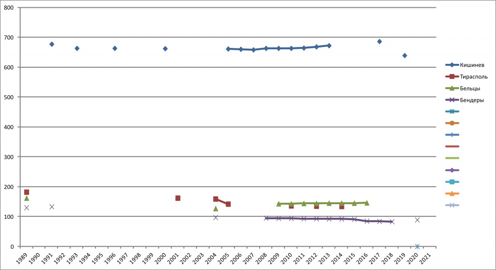 Если мы посмотрим на города, то в этом регионе сейчас расположены три крупных города — Кишинев, Тирасполь и Бельцы. Бендеры (Тигина), который был крупным городом на момент распада СССР, потерял этот статус в 1990-е. Точная численность населения городов в регионе непонятна, но в целом можно считать, что их население тоже снижалось, но более низкими темпами, чем население стран в целом. Хотя, возможно, население Тирасполя и Бендер падало быстрее, чем в окружающей сельской местности.