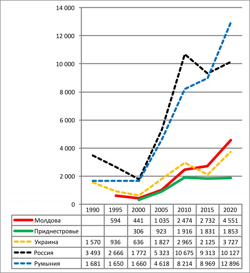 Экономика региона падала в 1990-е и в основном росла в XXI веке. Однако, если до кризиса 2008–2009 годов показатели подушевого ВВП в Республике Молдова и Приднестровской Молдавской республике были сходны, то после этого (а уж тем более после 2014 года) стал нарастать отрыв экономики Молдовы не только от Приднестровья, но и от соседней Украины. Так, в настоящий момент ВВП на душу населения Молдовы превышает соответствующий показатель Украины на 20%, а Приднестровья — почти в 2,5 раза. Но при этом уступает уже российскому уровню подушевого ВВП почти в 2,5 раза, а румынскому — почти в 3.