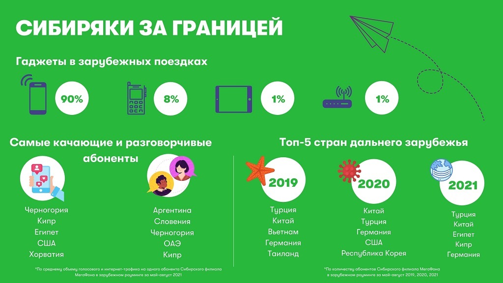 Аналитики «МегаФона» при помощи Big Data изучили обезличенные данные об активности сибирских абонентов за границей. Количество путешественников из региона с мая по август 2021 выросло почти вдвое по сравнению с аналогичным периодом прошлого года. Но все же их на 40% меньше, чем в допандемийном 2019 году. Самым активным месяцем для дальних путешествий оказался август.