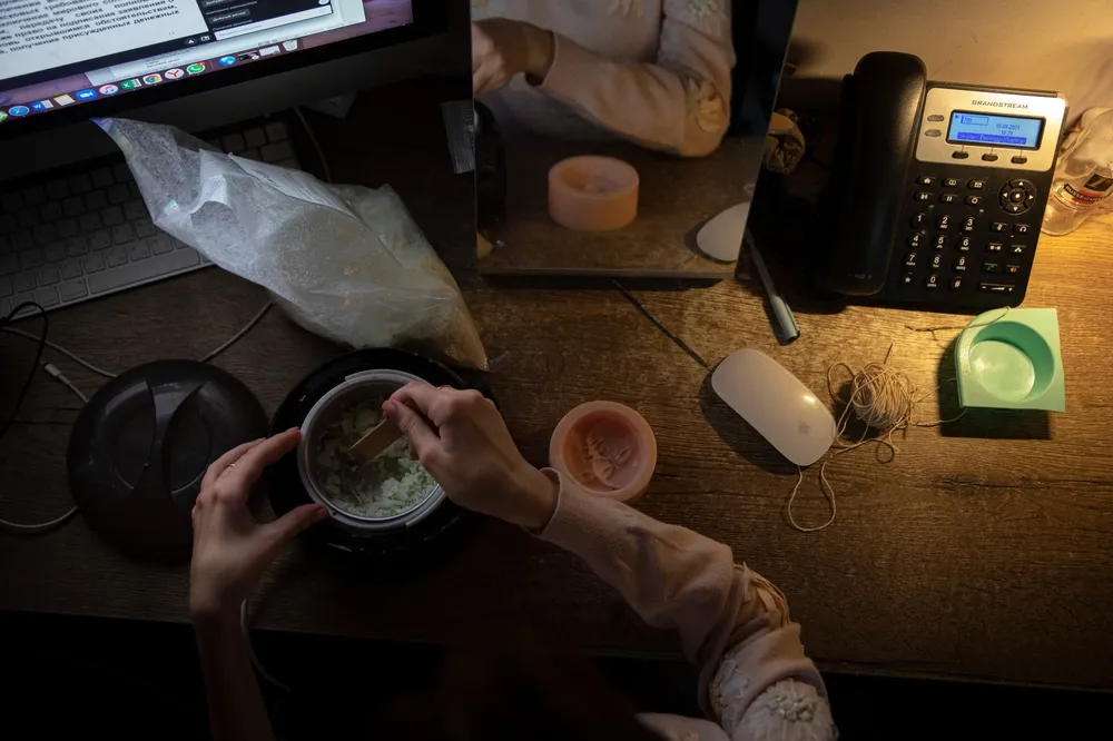 Нагреваясь, воск становится тягучим и прозрачным. Катя отрезает кусочек фитиля, кладет его в формочку с оттиском луны и месяца и затем аккуратно переливает туда горячую жидкость. Воск застывает и снова становится белым.