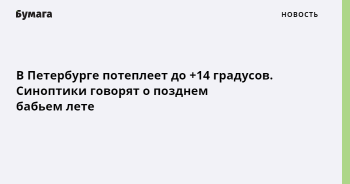 Ранее о том, что 27 сентября можно ожидать начала бабьего лета, «Бумаге» говорил главный синоптик Петербурга Александр Колесов. По его словам, в конце сентября дневная температура будет преимущественно держаться в диапазоне от +10 до +15 градусов — примерно так же тепло будет и в первые дни октября.