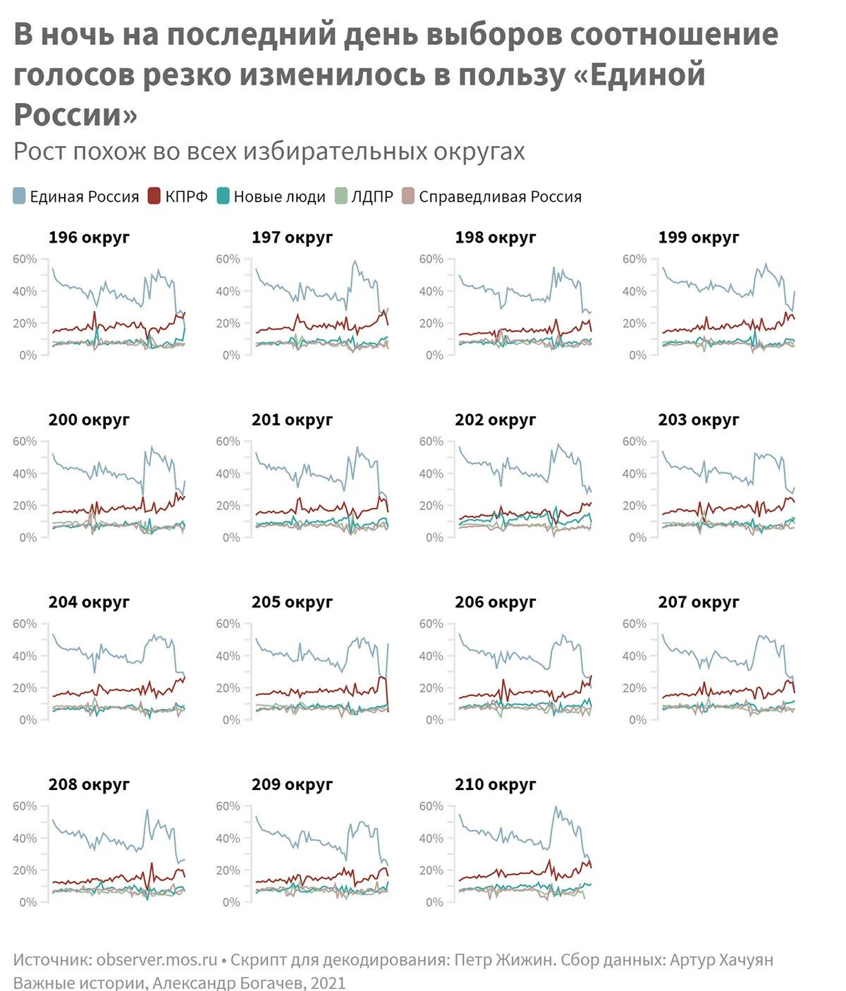 Такой всплеск процента электронных голосов за «Единую Россию», как под копирку, повторился на всех избирательных округах.