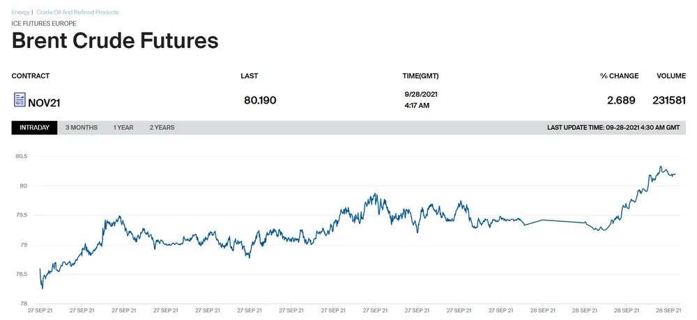 По состоянию на 7:17 мск цена декабрьских фьючерсов на Brent выросла на 0,85%, до $79,36 за баррель, ноябрьских — на 0,83%, до $80,19 за баррель, Эта отметка преодолена впервые с октября 2018 года.