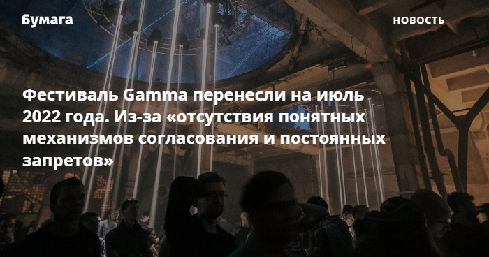 Фестиваль медиаискусства Gamma, запланированный на октябрь, перенесли. Он пройдет в Петербурге 8–10 июля 2022 года. Об этом сообщили организаторы — петербургская группа m_division.
