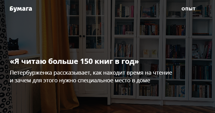 — Когда я читаю, то расслабляюсь, поэтому стараюсь сделать так, чтобы для книг было время. Я работаю каждый день, но по вечерам всегда выделяю время на чтение. Я обустроила себе гнездо — диван с пледами, рядом стоит прикроватный столик, где лежат книги, которые я сейчас читаю, туда можно поставить чай, фрукты. Когда сажусь читать, приходят кошки и облепляют меня.