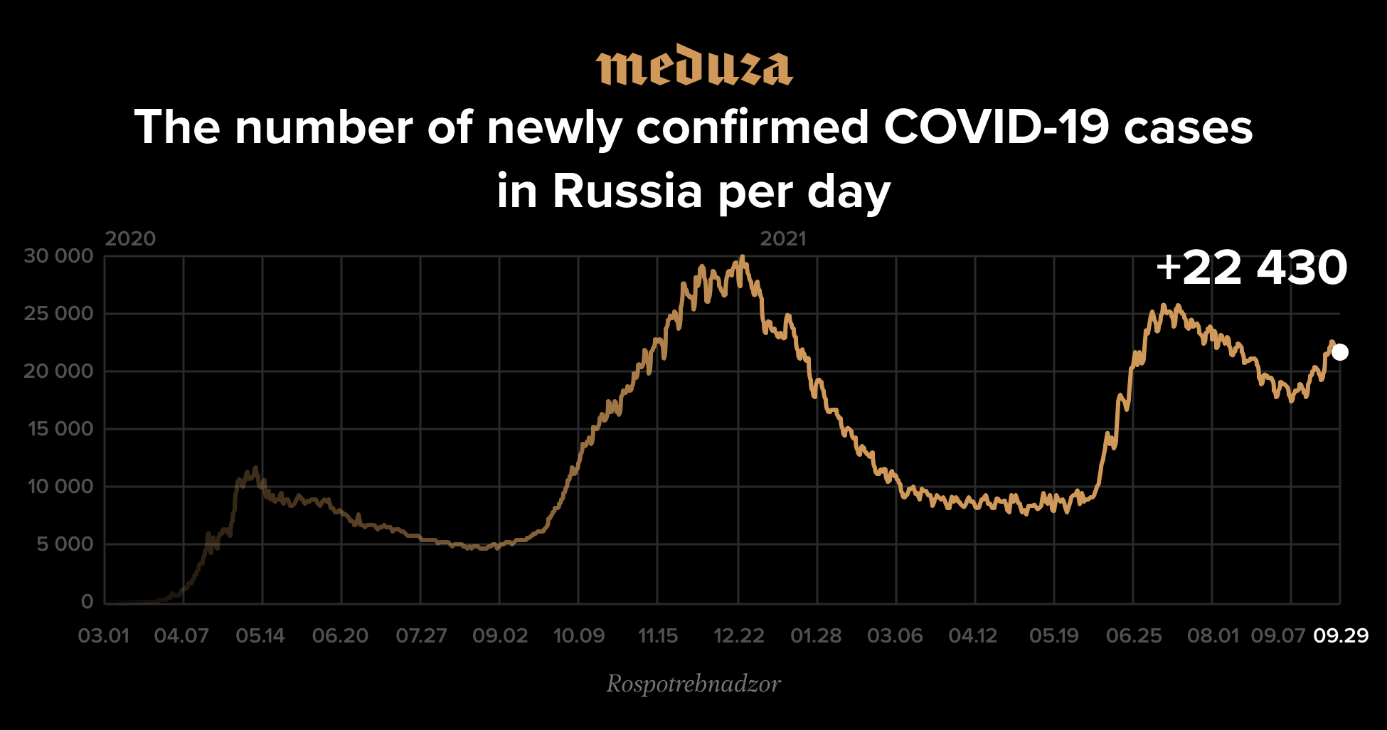 During the third wave’s peak in the summer of 2021, Moscow recorded more than 9,000 coronavirus cases and nearly 2,000 related hospitalizations daily. Though it appears indicators like these are still a long way off, according to Meduza’s sources, the Moscow Mayor’s Office is already bracing for a fourth wave. At a meeting on September 22, city officials reportedly discussed the possibility of reintroducing tighter public health restrictions, such as partially transferring companies to remote work, requiring QR codes that link to proof of vaccination or a negative PCR test for visiting cafes and movie theaters, and mandatory self-isolation for the elderly and people with chronic illnesses.