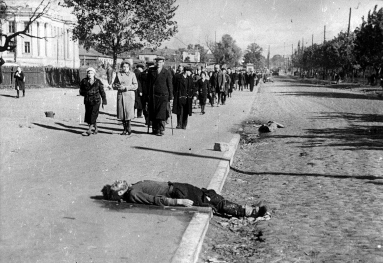 Киевских евреев конвоируют в Бабий Яр. На тротуаре и мостовой — тела участников предыдущих этапов, убитых при малейшем намеке на неповиновение или при попытке к бегству. Сентябрь-октябрь 1941