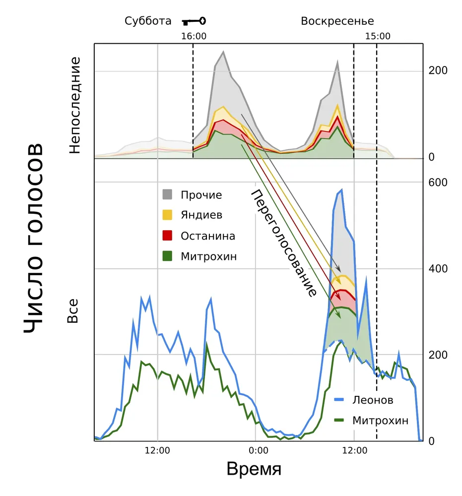 Голоса за Митрохина были отданы в период с 16.00 в субботу до 12.00 в воскресенье. А скрутка этих голосов происходила с 08.00 до 15.00 в воскресенье. Переголосование половины голосов за оппозицию, и при этом практически непереголосование за власть — уже невозможно объяснить с помощью «слепой» модели.