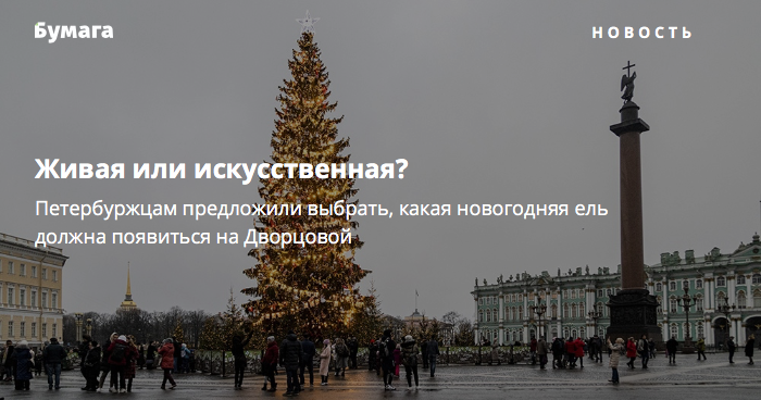Власти спрашивают мнение горожан не впервые: в прошлом году в преддверии новогодних праздников также проводился опрос, по результатам которого на главной городской площади появилась живая ель. До этого на протяжении восьми лет устанавливали ель искусственную. При этом ранее, в 2013-м, заменить живое дерево на искусственное тоже решили по итогам опроса петербуржцев.