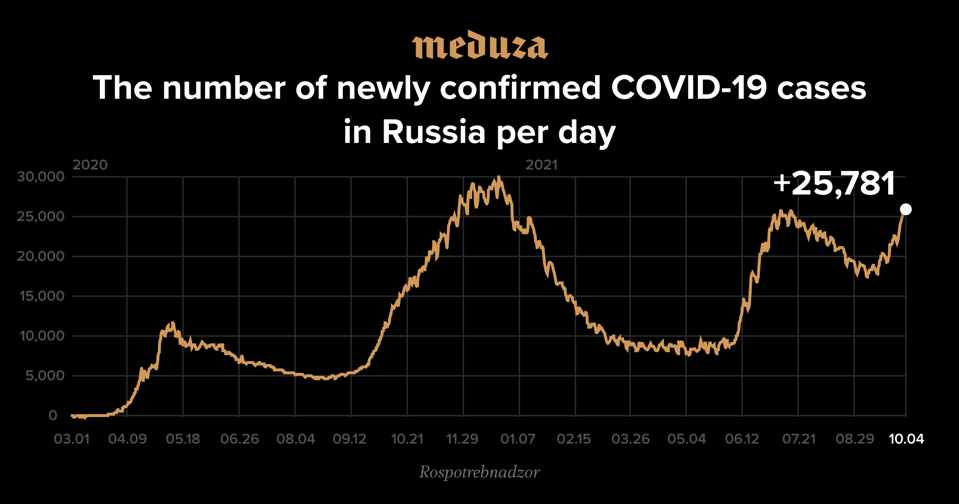 On Monday morning, October 4, Russia’s anti-coronavirus headquarters reported that 25,781 new cases of COVID-19 were recorded in the past 24 hours. This is the highest daily increase the country has seen since January 2, 2021, when Russia reported 26,301 new coronavirus cases.