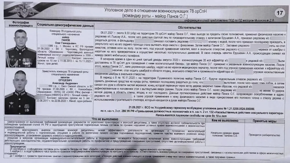 Ранее руководитель проекта Gulagu.net Владимир Осечкин опубликовал внутренние документы, предположительно относящиеся к презентации Минобороны РФ. В них утверждалось, что в Хабаровском крае командир «78-й отдельной роты специального назначения» майор Олег Панов и его заместитель капитан Александр Ерушевич находятся под следствием в связи с эпизодами сексуализированного насилия над подчиненными.