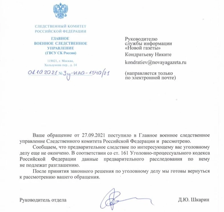 «Новая газета» также обратилась с официальным запросом по ситуации к руководителю пресс-службы Минобороны РФ Игорю Конашенкову, однако до сих пор не получила ответа.