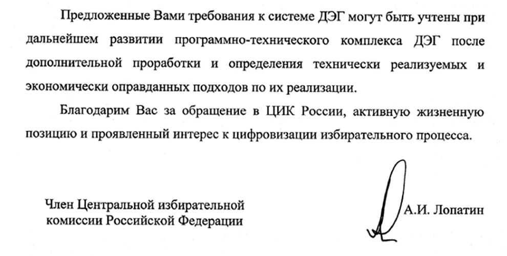 По просьбе Э.А. Памфиловой направить всем свои предложения по ДЭГ, высказанной на общественном обсуждении интернет-голосования в прошлом году, аналогичный документ был направлен и в ЦИК России. В своем ответе ЦИК сообщил, что предложенные требования «могут быть учтены при дальнейшем развитии программно-технического комплекса ДЭГ после дополнительной проработки и определения технически реализуемых и экономически оправданных подходов по их реализации». Конечно, непонятно, как техническая реализуемость или экономическая оправданность может стать причиной сокращения имеющихся прав участников избирательного процесса, установленных 67-ФЗ.