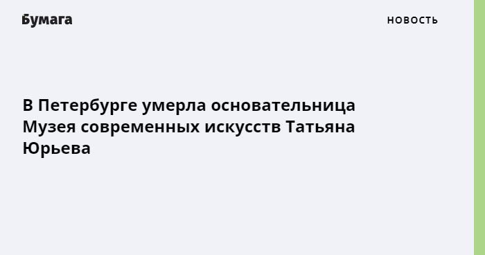 В Петербурге в возрасте 77 лет умерла искусствовед, основательница и бессменная глава Музея современных искусств имени Дягилева при СПбГУ Татьяна Юрьева. Об этом сообщил писатель Андрей Аствацатуров.