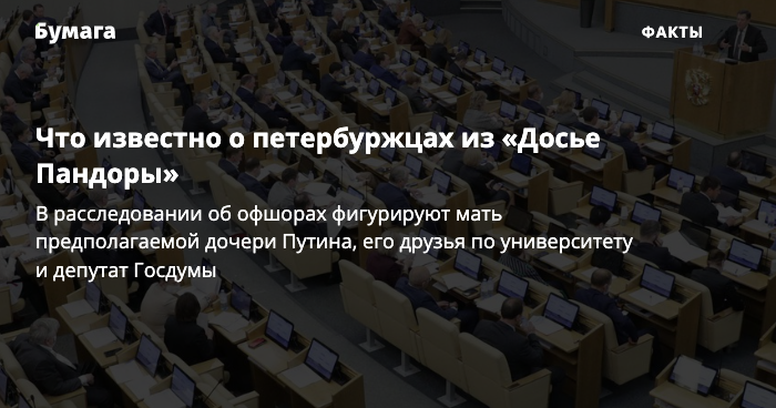 В материалах упоминаются 25 россиян — сенаторы, чиновники, главы госкорпораций и люди из окружения президента Владимира Путина, в том числе четыре человека из Ленинграда. «Бумага» рассказывает, что о них известно и о каких офшорах говорится в досье.