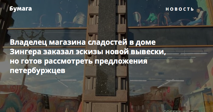 Владелец магазина сладостей в доме Зингера заказал эскизы новой вывески, но готов рассмотреть предложения петербуржцев. Об этом он сообщил «Бумаге».