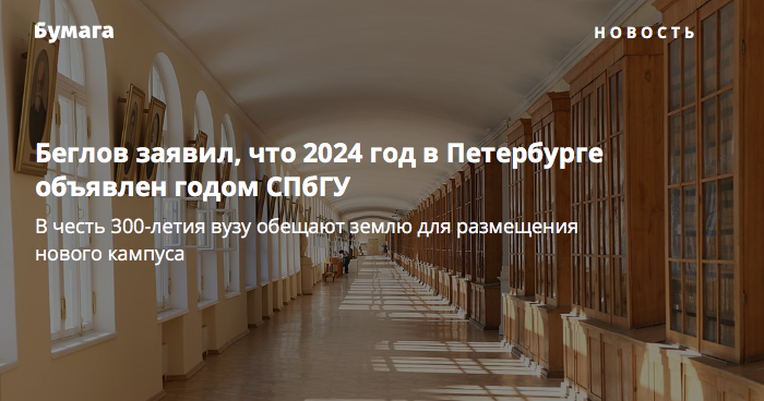 В честь 300-летия Санкт-Петербургского государственного университета 2024 год объявлен годом СПбГУ. Об этом в эфире «Радио России» заявил губернатор города Александр Беглов. Губернатор также сообщил, что в связи с этой датой вуз получит землю в Пушкинском районе для размещения нового кампуса.