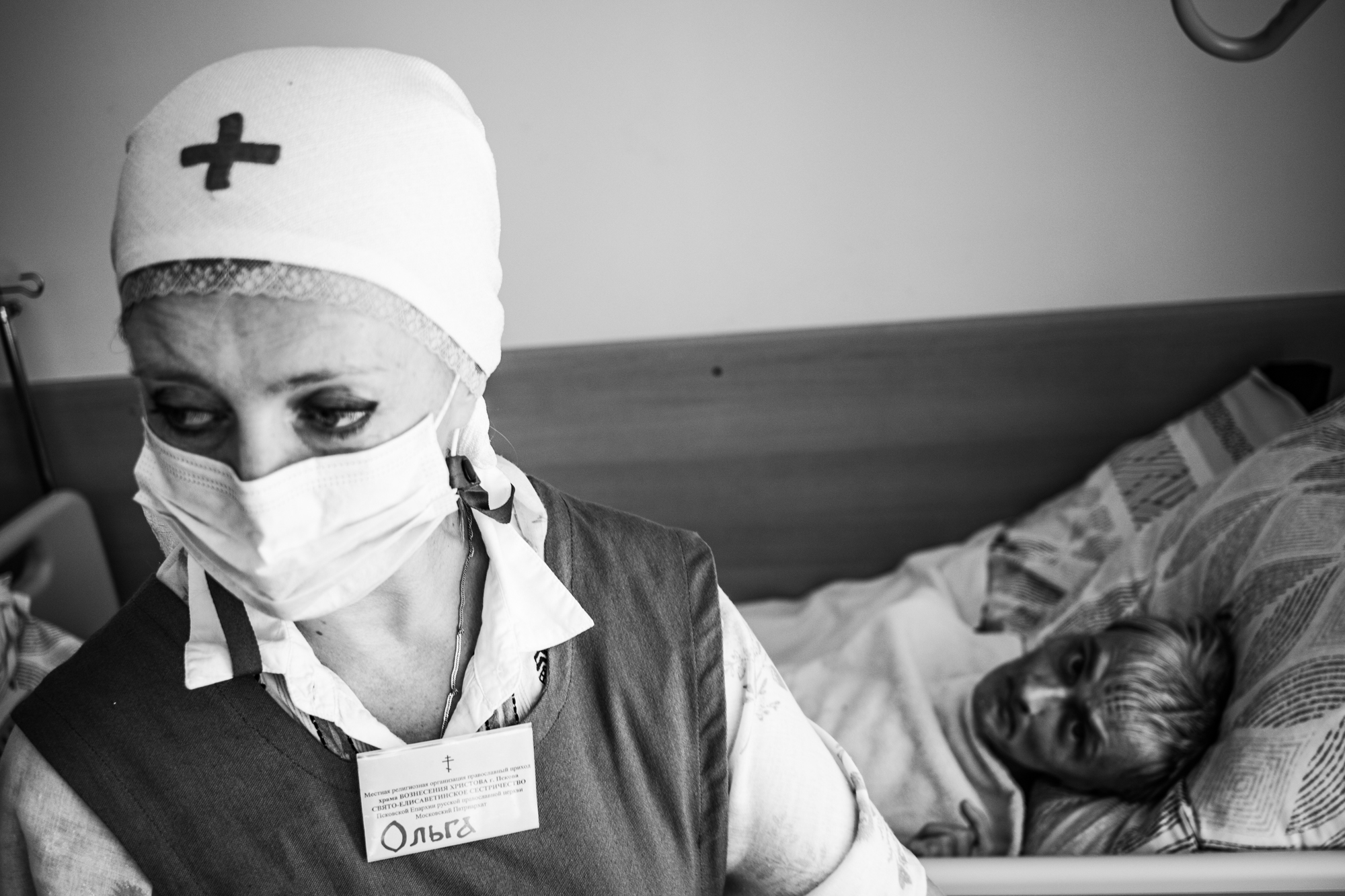 Сестра милосердия будит монахиню Агриппину. Сестры приезжают в монастырь рано утром и проводят в нем целый день, ухаживая за Агриппиной