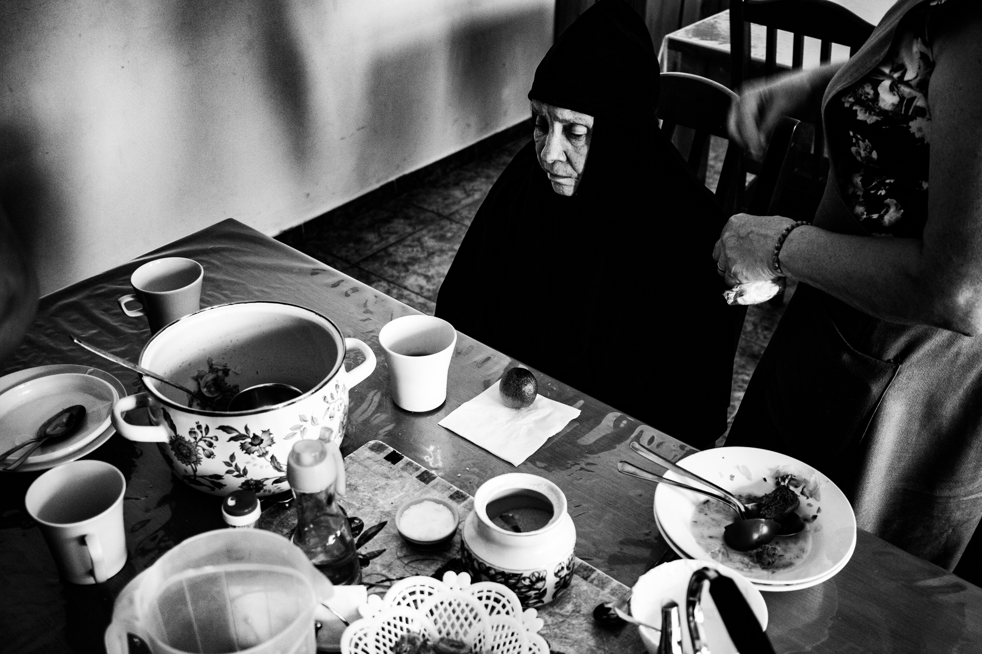Монахиня Агриппина на трапезе после утренней службы. Сестры помогают ей положить еду и ждут, пока она закончит обедать. После этого — тихий час