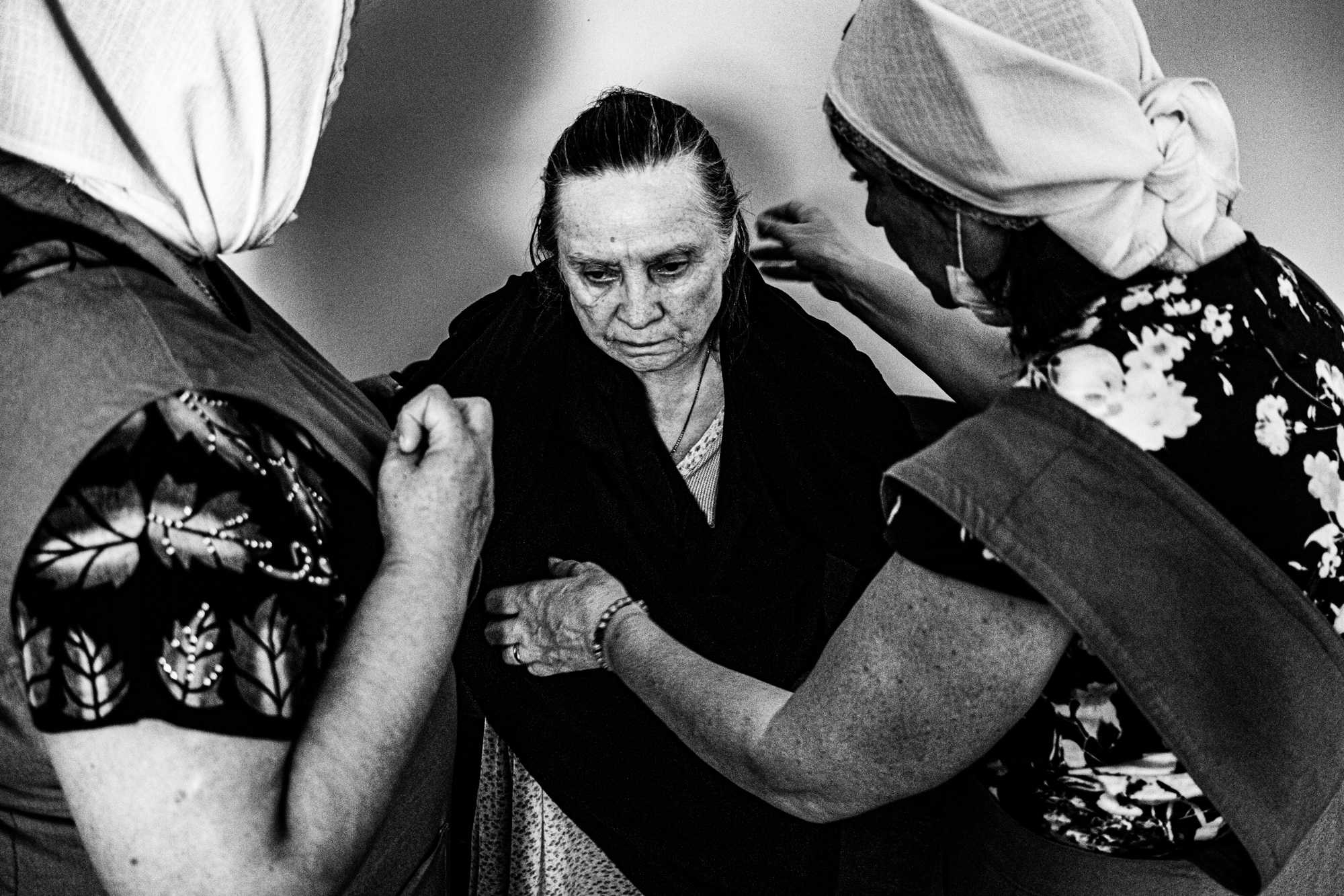 Сестры одевают монахиню Агриппину для похода на утреннюю службу. Монашеское одеяние обязательно должно быть надето поверх ночного платья