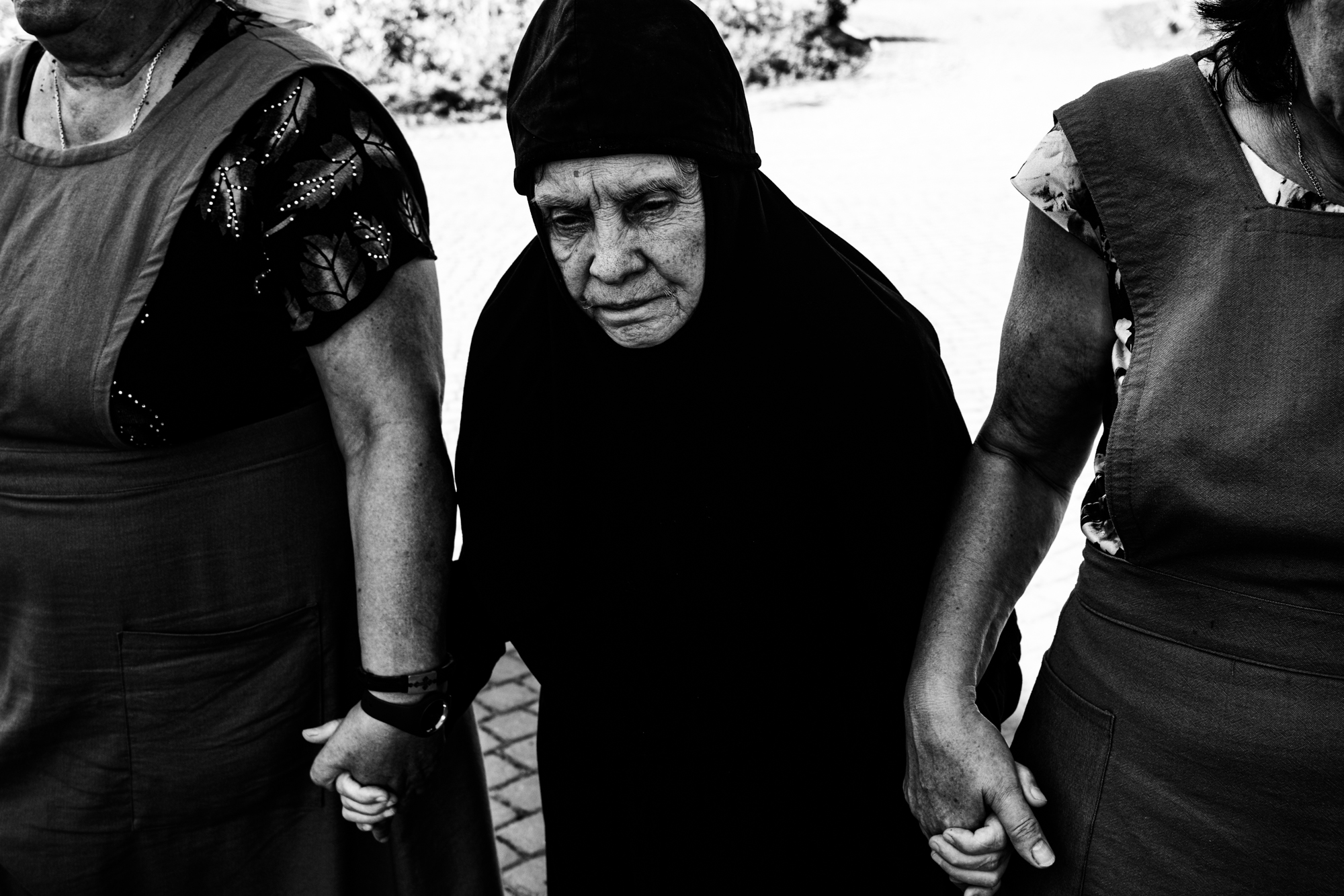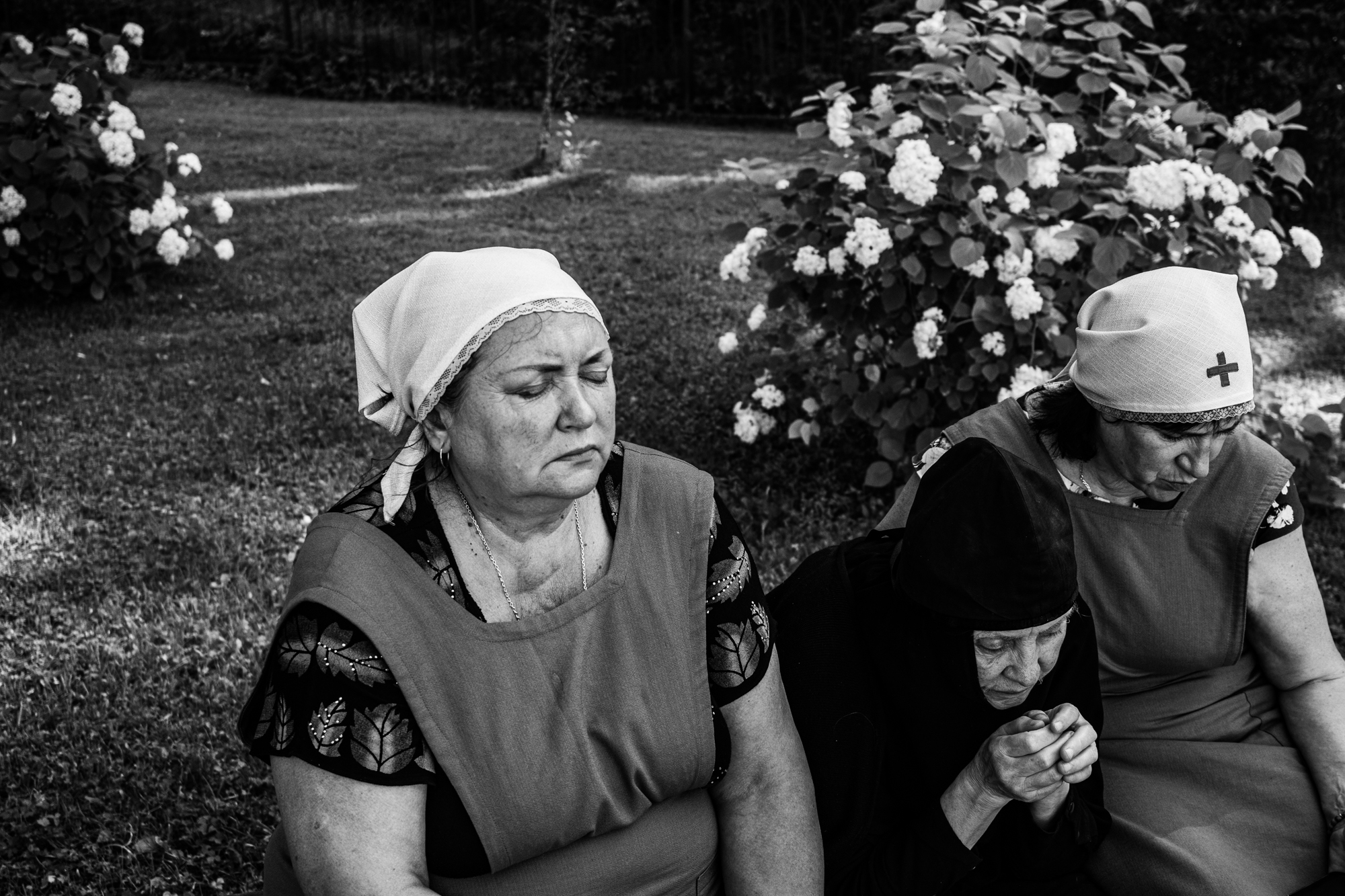 Монахиня Агриппина во время прогулки с сестрами. В это время они слушают молитвы в записи или сами читают их вслух. Агриппина иногда вспоминает знакомые слова и присоединяется к молитве
