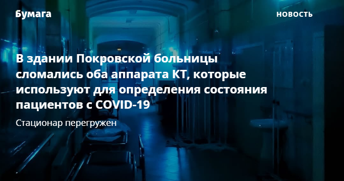 В здании Покровской больницы уже неделю сломаны два аппарата КТ, которые используют для определения состояния пациентов с COVID-19. Об этом сообщила «Фонтанка» со ссылкой на пресс-службу учреждения. Информацию подтвердили «Бумаге» в комитете по здравоохранению.