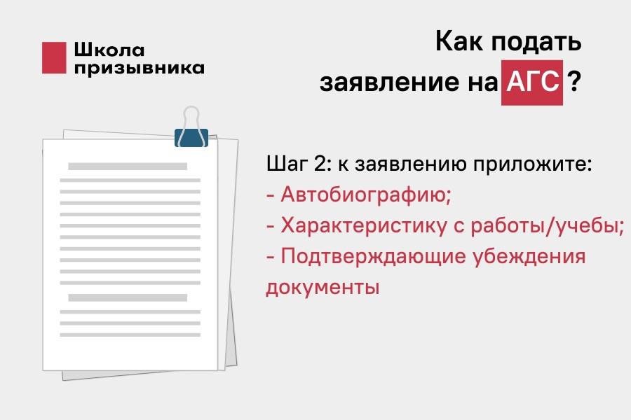 2. Подготовить заявление с приложениями в двух экземплярах. Приложения включают в себя: автобиографию, характеристику с места учебы/работы, документы, подтверждающие наличие убеждений.