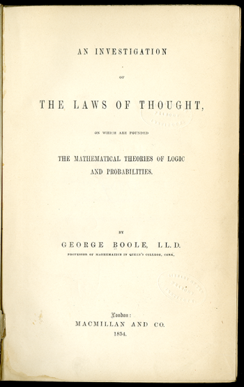 Булю не было и восемнадцати, когда ему пришло в голову, что высказывания и суждения логиков из числа последователей Аристотеля можно записать на языке алгебры. Поначалу это была лишь смутная догадка, но постепенно она обретала всё более ясные очертания. Так в 1854 году появился на свет его капитальный труд объемом 424 страницы под названием «Исследование законов мышления, на которых основываются математические теории логики и вероятностей», обычно коротко называемый «Законы мышления».