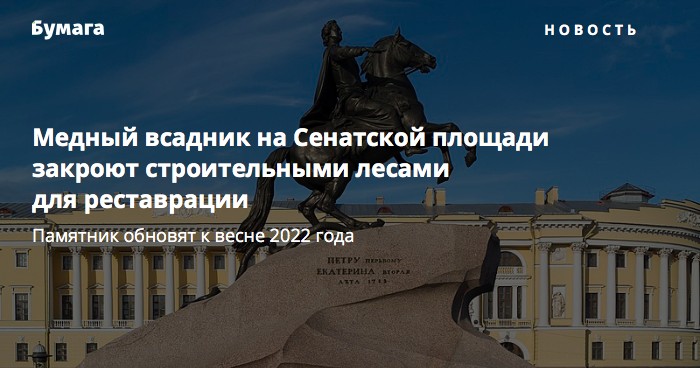 Медный всадник на Сенатской площади закроют строительными лесами для реставрации
