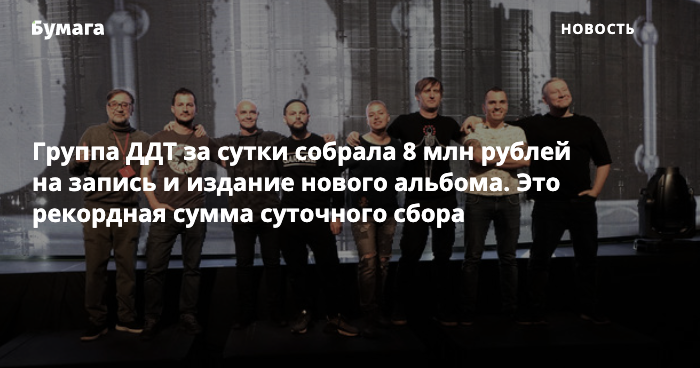 Группа ДДТ за сутки собрала почти 8 миллионов рублей на запись нового альбома на краудфандинговой платформе Planeta.ru. Коллектив Юрия Шевчука установил рекорд российского краудфандинга по суточной сумме сбора.