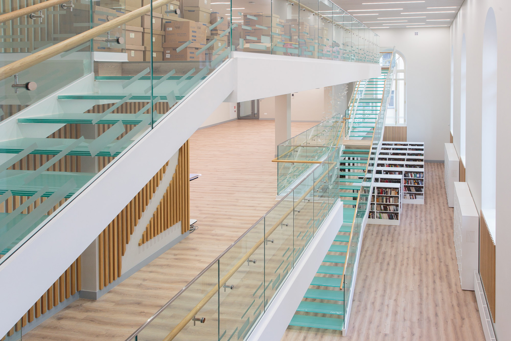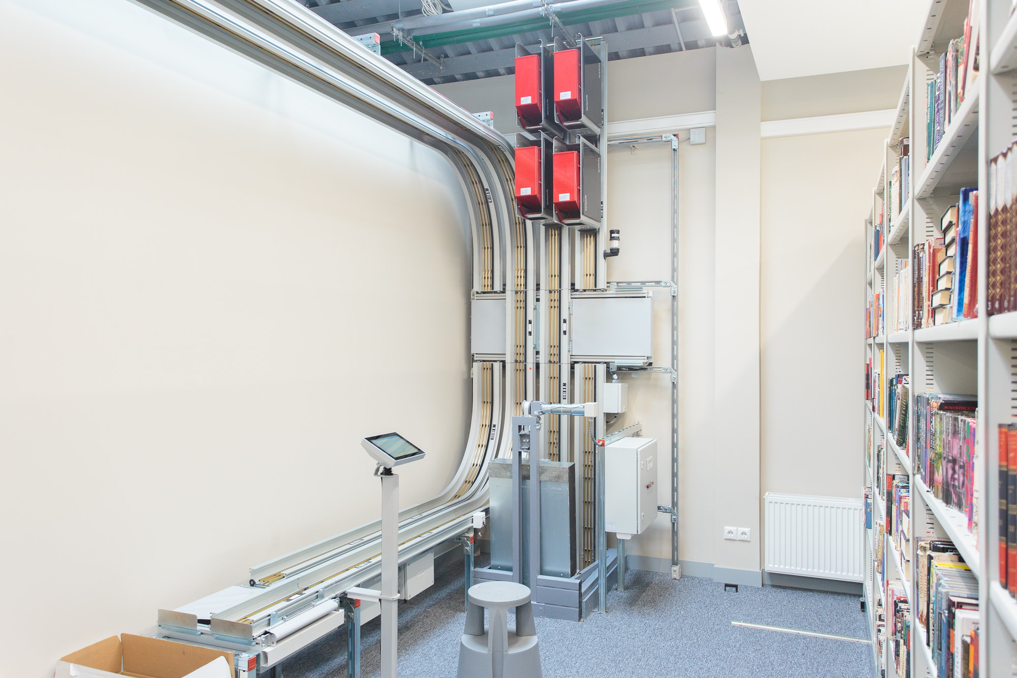 Все эти пространства тоже оснастили современным оборудованием — например, стеллажи в зоне закрытого хранения можно подвинуть, нажав на кнопку. А книги для читателей спускают и поднимают с помощью нового телелифта: издания помещают в специальные боксы и отправляют на нужный этаж.