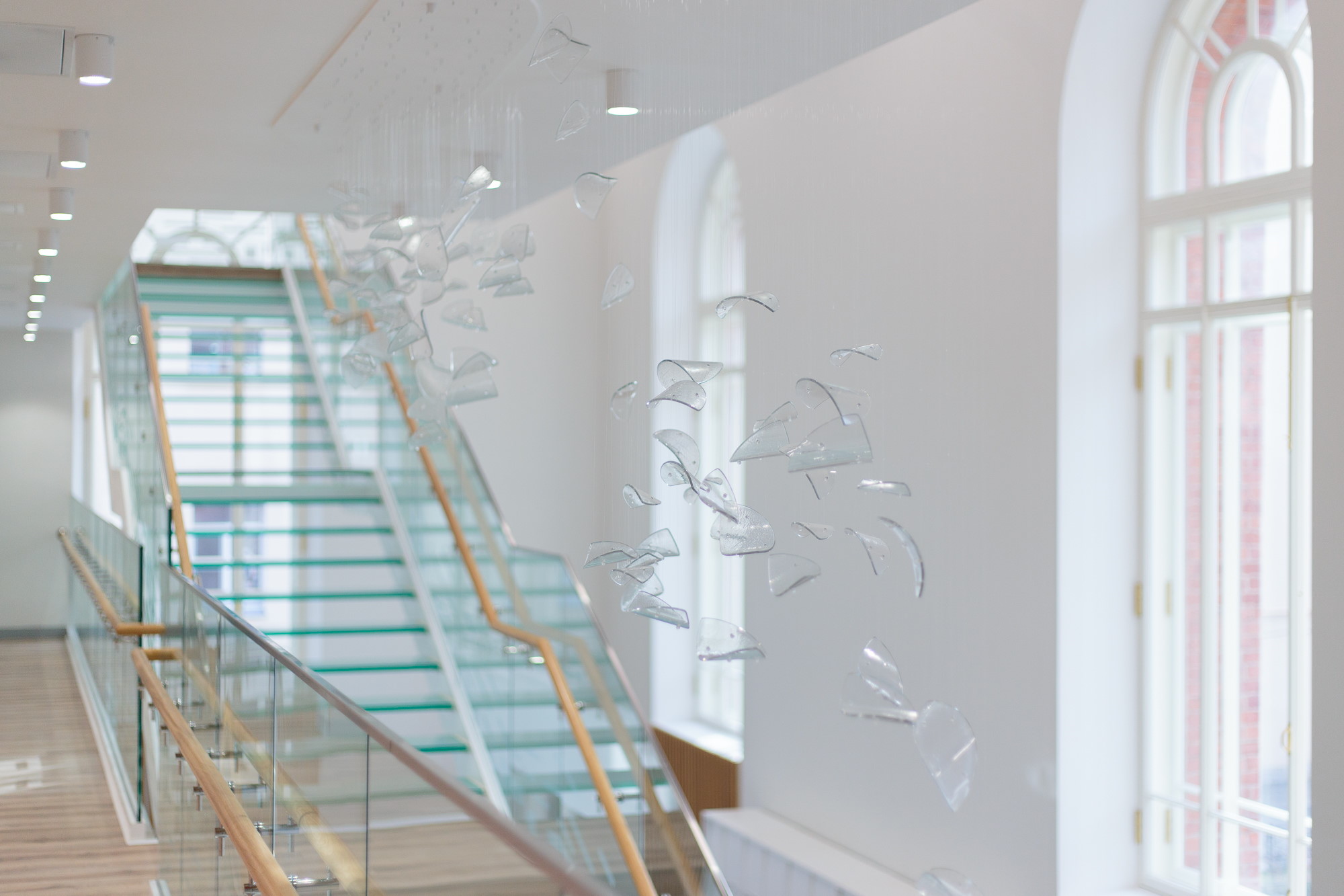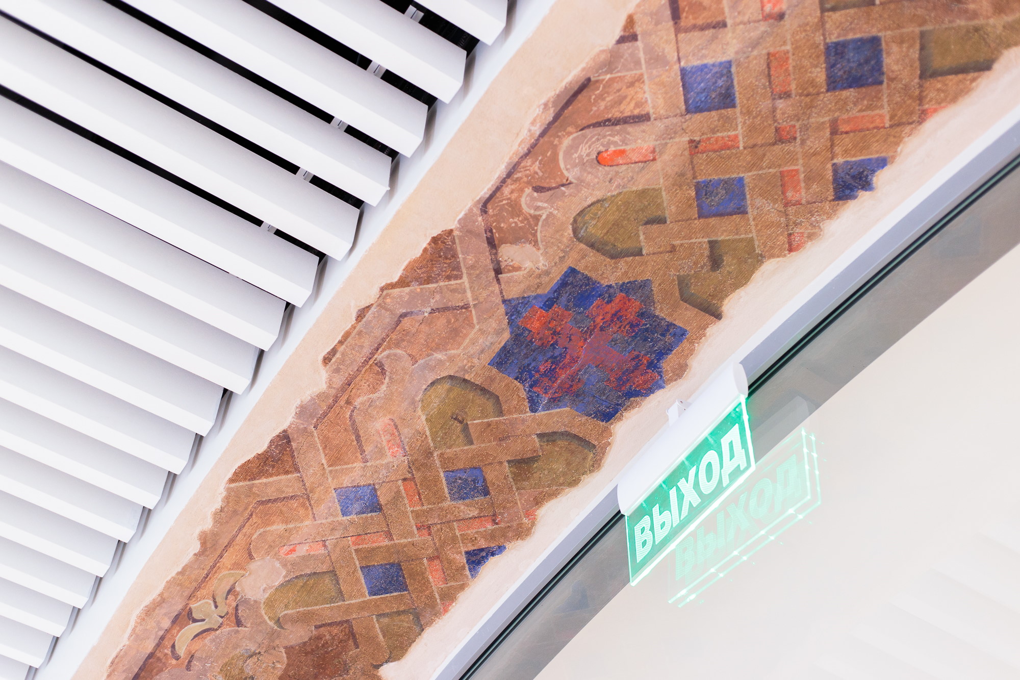 Кроме того, при демонтаже штукатурки на одной из потолочных арок нашли оригинальную роспись 1880-х годов. Рисунок сохранили, и теперь он соседствует с новыми стеклянными конструкциями.
