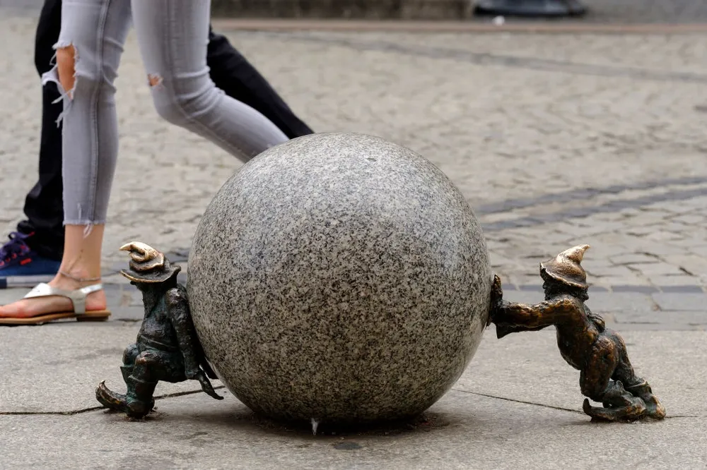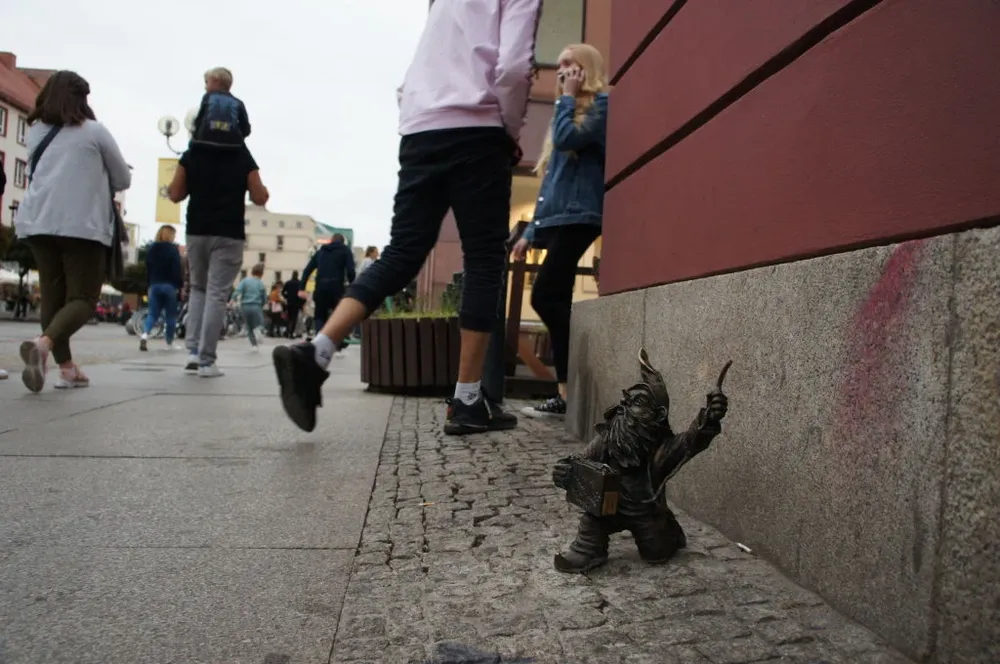 Но на улицах Вроцлава можно встретить и кое-что еще: то там, то тут стоят маленькие бронзовые гномы (говорят, их уже несколько сот), они работают, пляшут, выпивают… У Народного дворца музыки из них составлен целый оркестр с дирижером, рядом с туристическим агентством — гном-путешественник с чемоданом, у стены отеля — постоялец, спящий на кровати. Этот забавный народец, новейшая достопримечательность Вроцлава, возник неспроста. В последние годы коммунистической власти здесь действовала акционистская группа «Оранжевая альтернатива», которая рисовала гномов на стенах и устраивала массовые костюмированные демонстрации под протестно-абсурдистскими лозунгами типа «Гномы за коммунистическую революцию». Теперь эти художественные акции застыли в бронзовых фигурках на тротуаре; артистический протест, как обычно и бывает, присвоен коммерцией — отели и рестораны заказывают себе своих гномов, рекламируя себя.