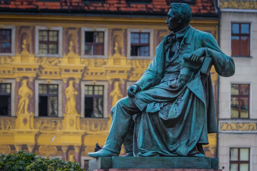 Вроцлав — симпатичный, нарядный город, его старинный центр аккуратно отстроили после военных разрушений, восстановив все фасады (но, конечно, не то, что за ними). Погуляв немного, замечаешь странность: на центральных улицах почти нет памятников. Лишь кое-где виднеются скромные бюсты и мемориальные доски в честь заслуженных поляков, и еще у самой ратуши стоит странный монумент комедиографу XIX века Александру Фредро (кто-то, возможно, помнит его пьесу «Дамы и гусары») — странный, потому что Фредро всю жизнь работал совсем в другом городе, Лемберге, ныне Львове.
