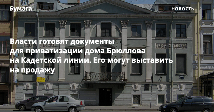 Комитет имущественных отношений Петербурга готовит документы, чтобы рассмотреть возможность приватизации дома Брюллова на Кадетской линии Васильевского острова. Об этом сообщили «Бумаге» в пресс-службе комитета.